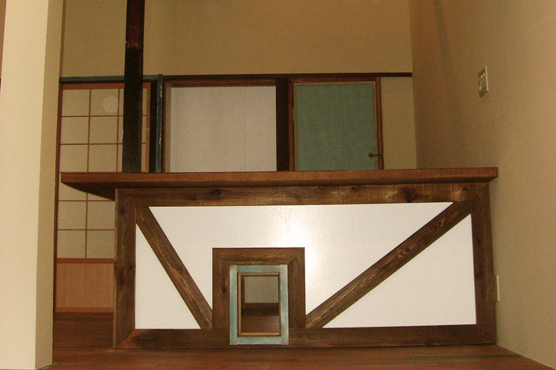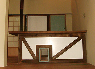 犬用のぞき窓付L字型カウンター天板杉材